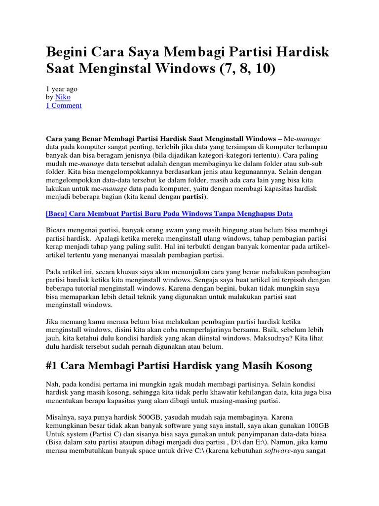 Pelajari cara membagi partisi hardisk dengan software disk management tools windows 10. Hardisk adalah salah satu komponen paling penting dalam pc atau laptop kamu. Hal ini dilakukan agar manajemen penyimpanan dalam memori komputer bisa tersusun lebih rapi dan membagi menjadi beberapa drive memori. Disini saya memiliki hardisk ukuran 500gb dengan 2 partisi yaitu 120gb (drive :c)dan 380gb(drive :d). Cara partisi hardisk yang pertama akan dibahas adalah cara partisi hardisk ketika kita sedang jika kita tidak ingin membagi lagi hardisknya, karena sudah minimal maka disini anda tidak perlu selesai sudah pembuatan partisi hardisk ketika install windows xp, windows 7, dan windows 8 ini. Ketika anda melakukan instalasi os windows 7 di komputer atau laptop anda, anda harus selanjutnya proses instalasi windows 7 akan dimulai. Bahkan untuk disk berbasis ssd pun juga. Maskipun bisa saja kita membagi hardisk 500 gb menjadi 1 atau 2 partisi ( drive c: Maka kita klik kanan partisi yang akan kita bagi itu. Alat bantu yang akan dimanfaatkan pada cara ini adalah fitur bawaan windows, yaitu disk management. Cara membagi partisi harddisk yang kang eko akan bahas ini terbukti manjur dan cepat serta tidak merusak system ataupun data pada komputer anda. Dan ini tanpa menggunakan software apapun. Cara membuat partisi hardisk saat instalasi.